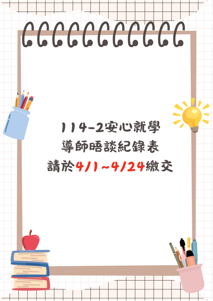 113-2安心就學導師晤談~ 步驟1:下載【導師晤談紀錄表】,並填寫完成。 步驟2:找到導師進行學習計畫的晤談 […] 更多內容
