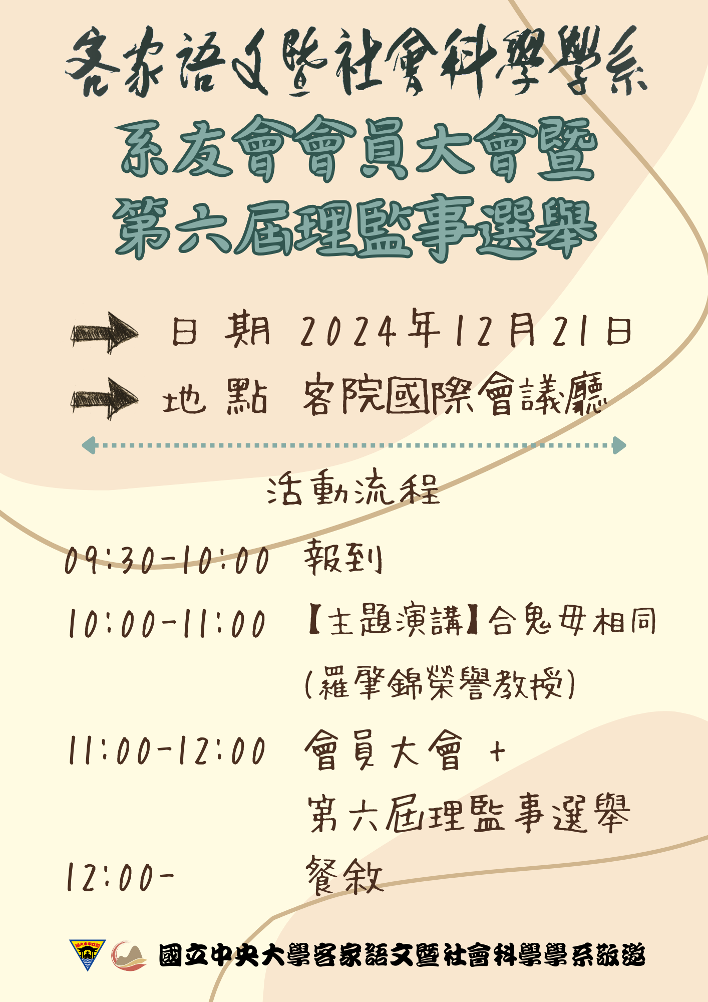 客家系2024年系友會會員大會暨第六屆理監事選舉,將於12月21日(六)登場,歡迎各位系友共襄盛舉。