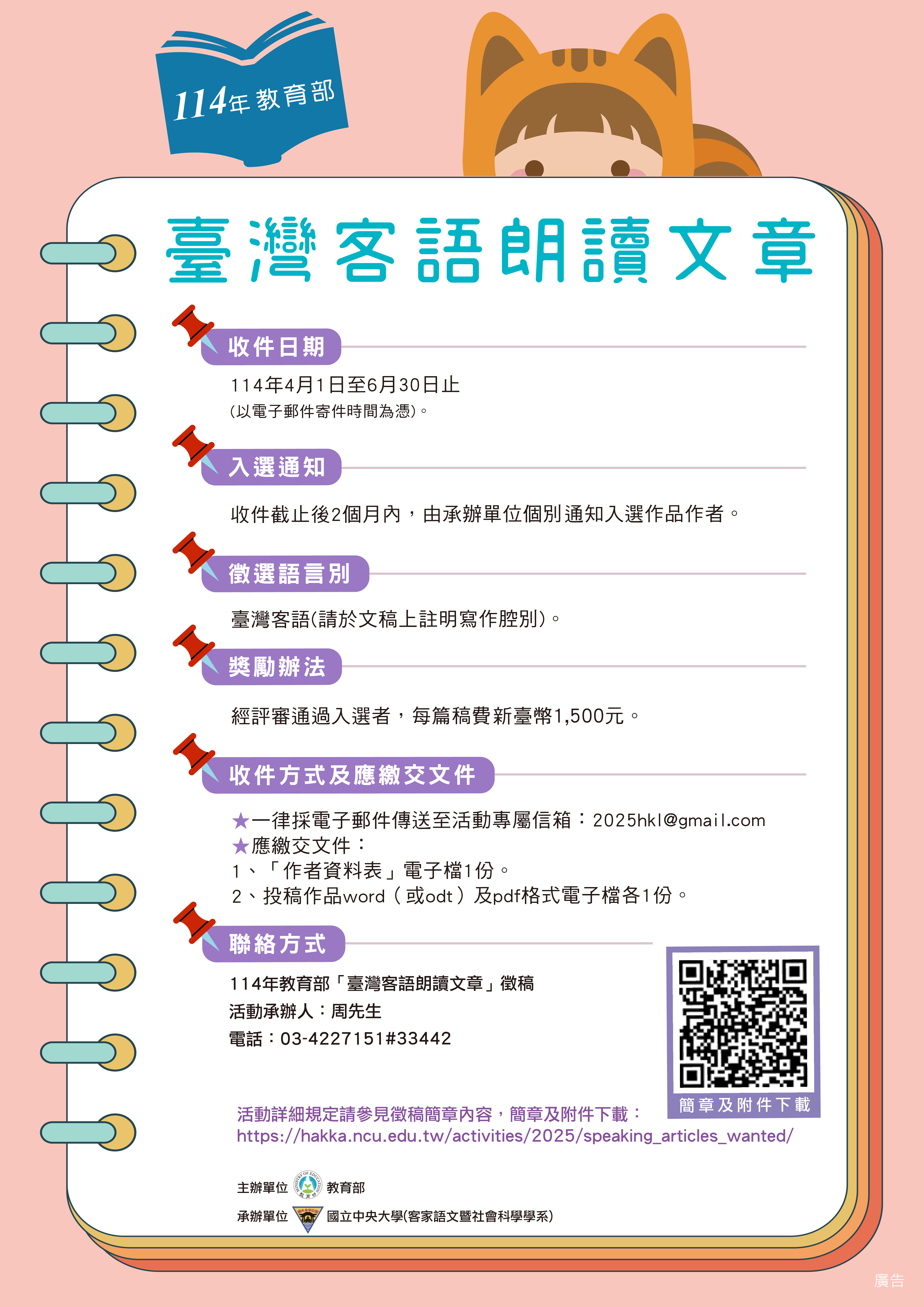 114年教育部「臺灣客語朗讀文章」徵稿活動於4月1日起開始公開徵求稿件,徵文題材以具生活化及現代化特色為佳,歡迎各界踴躍投稿!