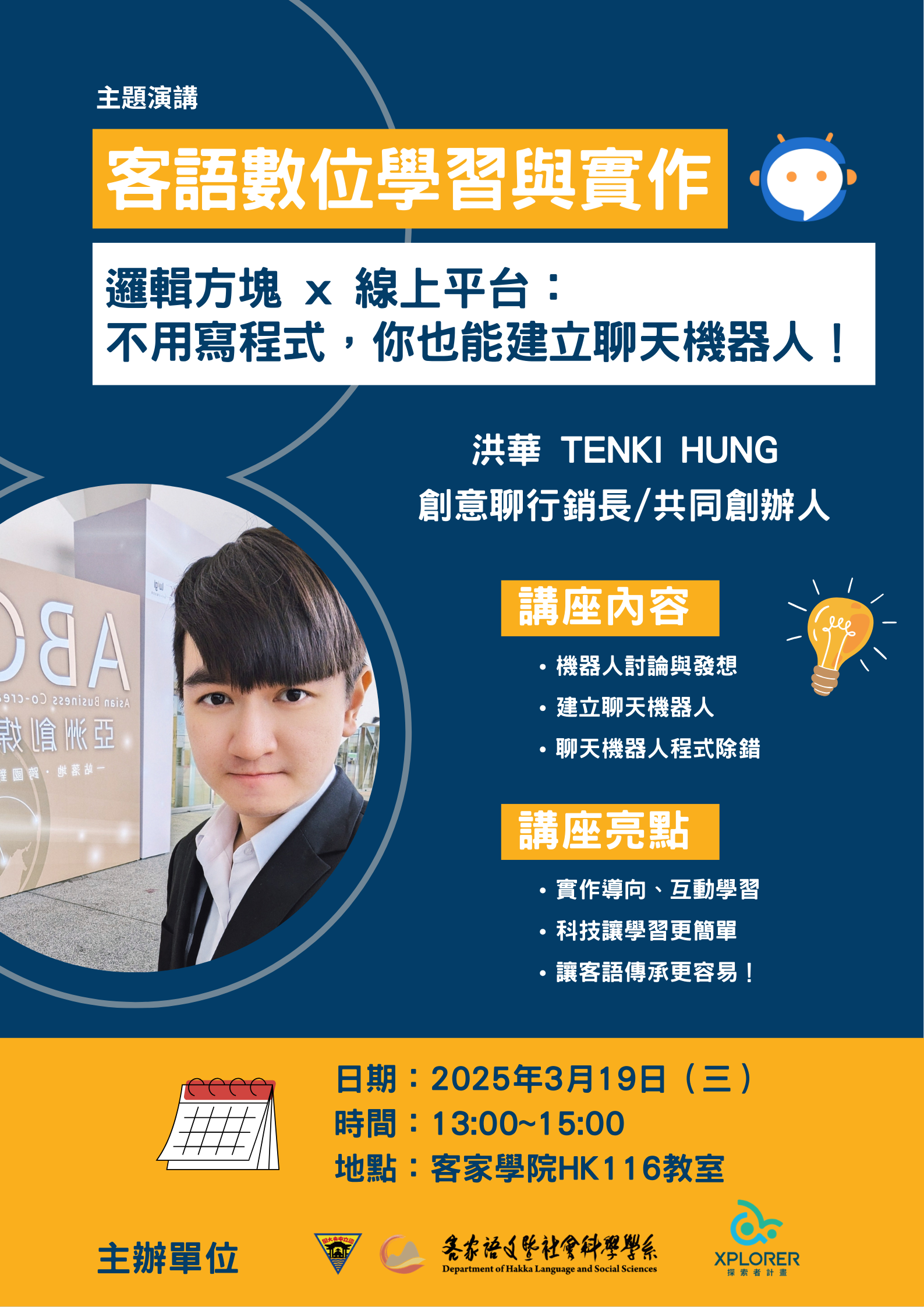 課程名稱:客語數位學習與實作主講人:洪華演講時間:114/03/19 13:00~15:00演講地點:國立中央大學客家學院HK116講題:邏輯方塊 x 線上平台:不用寫程式,你也能建立聊天機器人!
