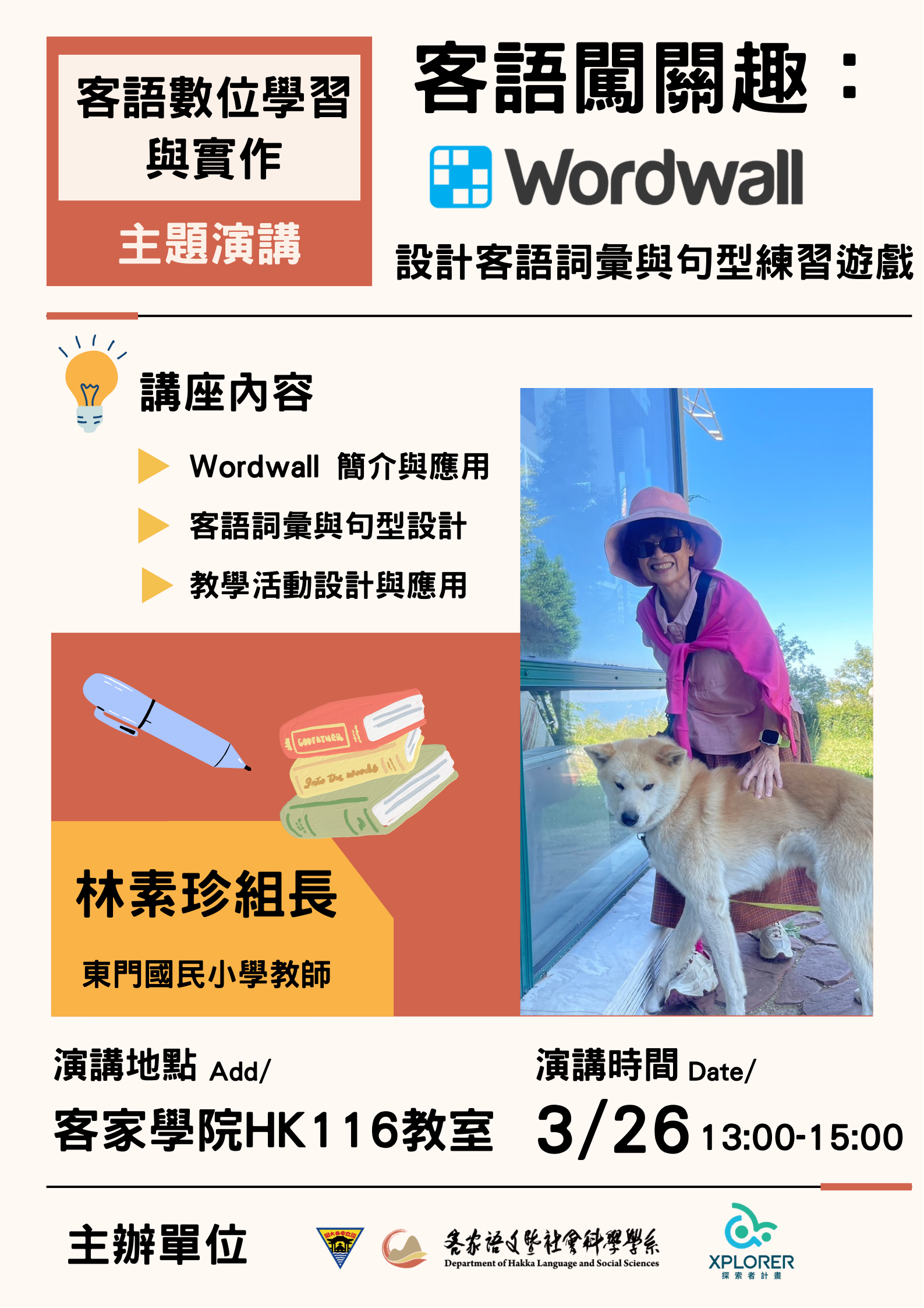 課程名稱:客語數位學習與實作主講人:林素珍演講時間:114/03/26 13:00~15:00演講地點:線上meet講題:客語闖關趣:WordWall 設計客語詞彙與句型練習遊戲