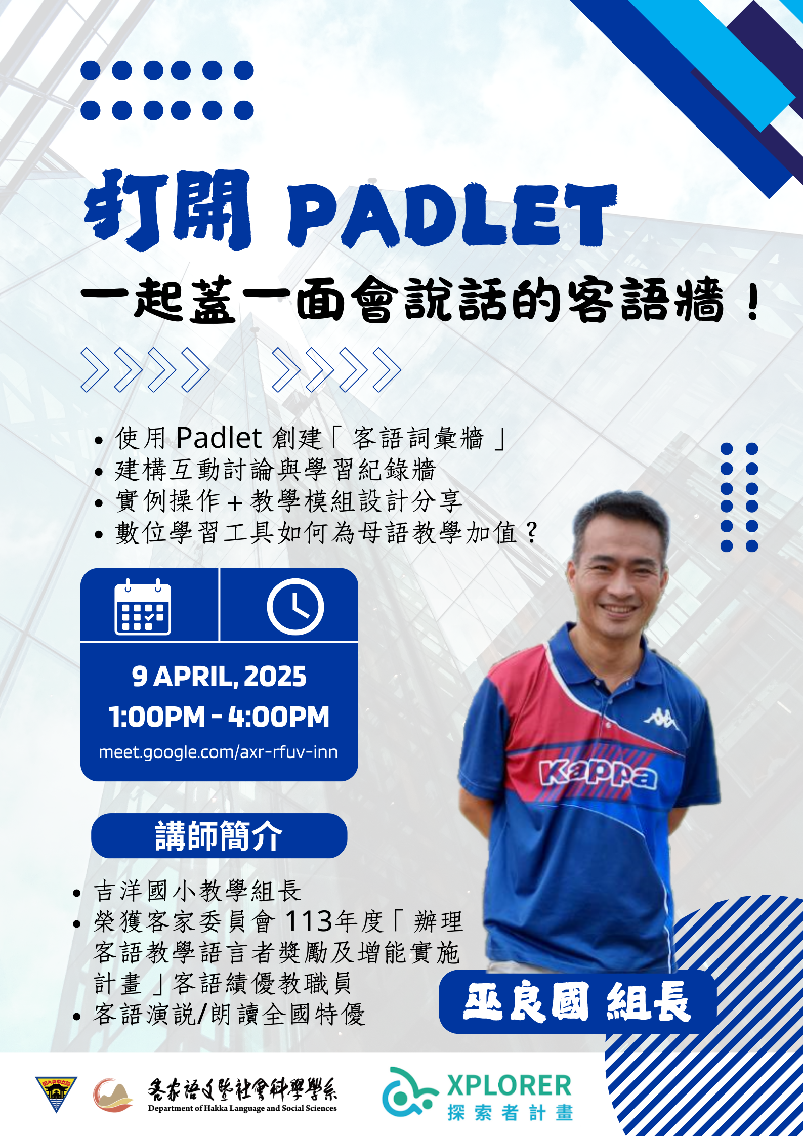 課程名稱:客語數位學習與實作主講人:巫良國演講時間:114/04/09 13:00~15:00演講地點:線上meet講題:打開padlet:一起蓋一面會說話的客語牆!
