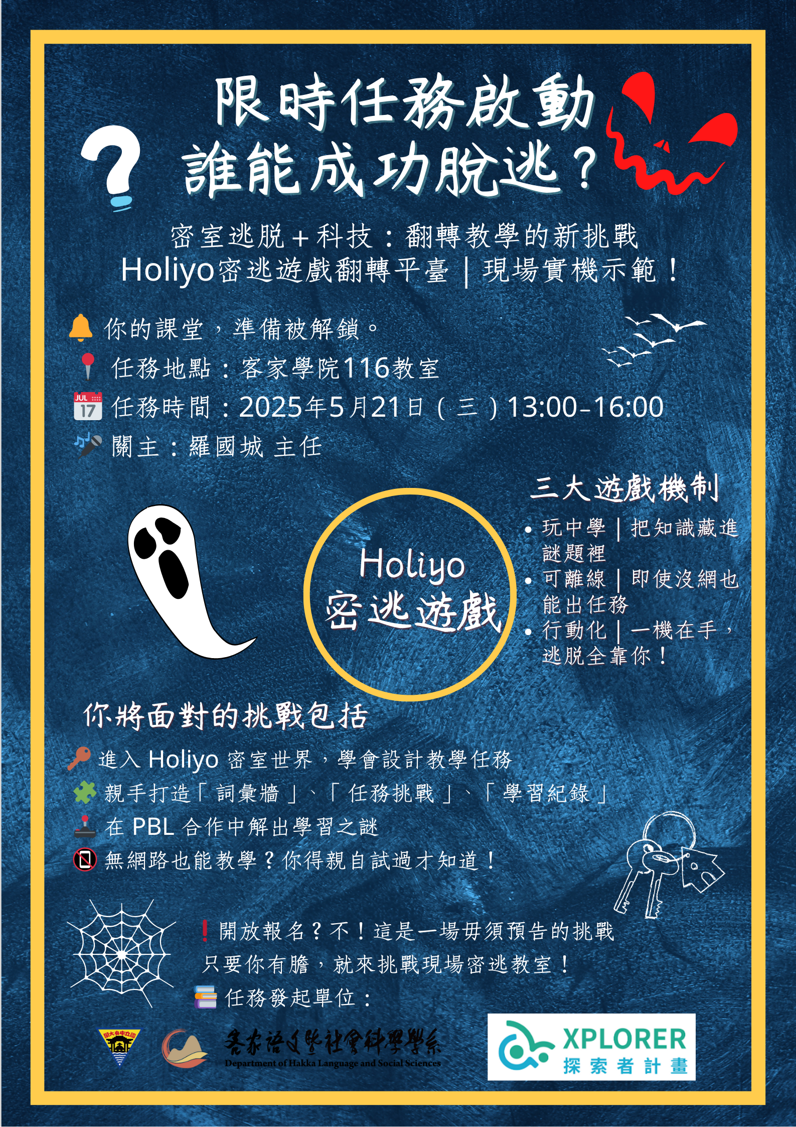 課程名稱:客語數位學習與實作主講人:羅國城演講時間:114/05/21 13:00~15:00演講地點:HK-116教室講題:Holiyo密逃遊戲翻轉平台