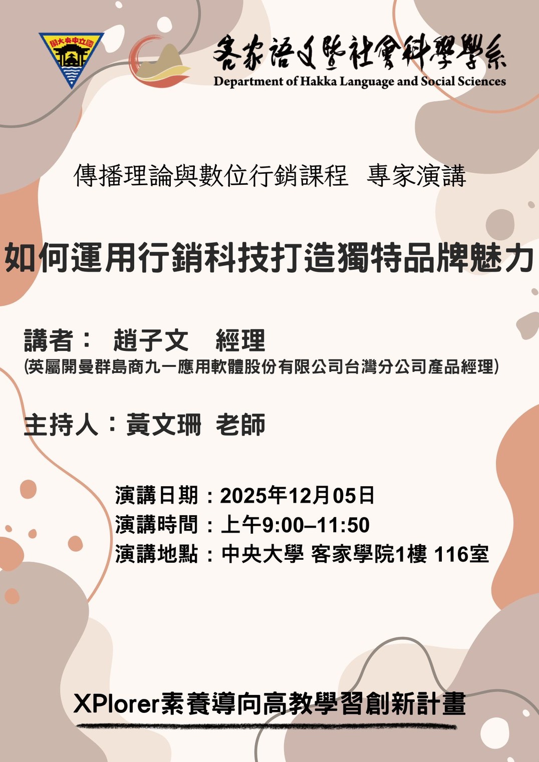 課程名稱:傳播理論與數位行銷課程主講人:趙子文經理演講時間:114/12/05 09:00~11:50演講地點:國立中央大學客家學院HK116講題:如何運用行銷科技打造獨特品牌魅力