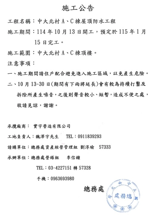 【施工公告】中大北村A、C棟屋頂防水工程 施工公告