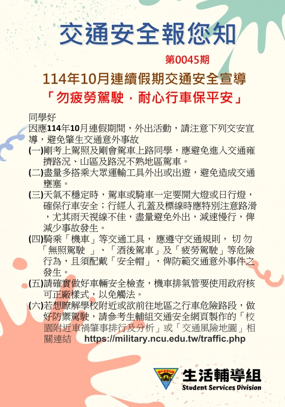 交通安全報您知第45期114年10月連假期交通安全宣導「勿疲勞駕駛,耐心行車保平安」