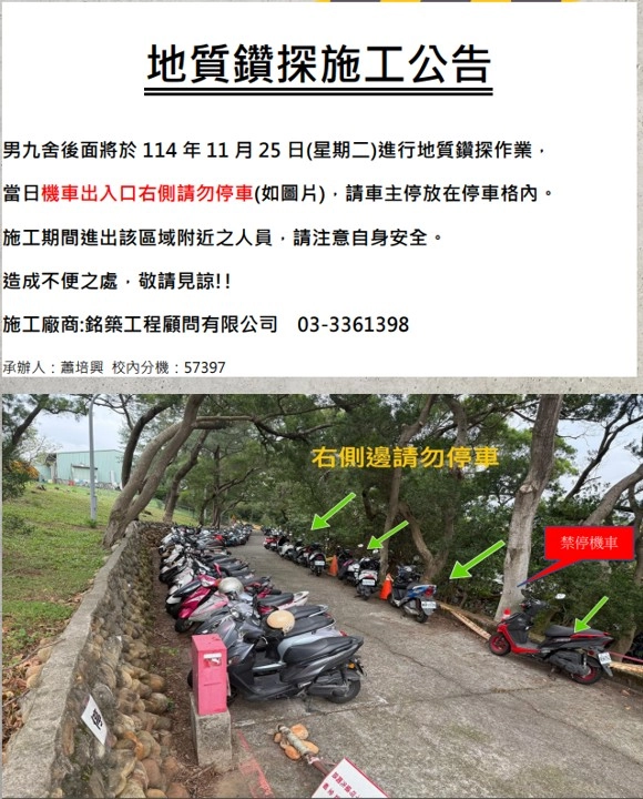 【地質鑽探施工公告】男九舍後面將於 114 年 11 月 25 日(星期二)進行地質鑽探作業, 當日機車出入口右側請勿停車(如圖片),請車主停放在停車格內。 施工期間進出該區域附近之人員,請注意自身安全。造成不便之處,敬請見諒!!