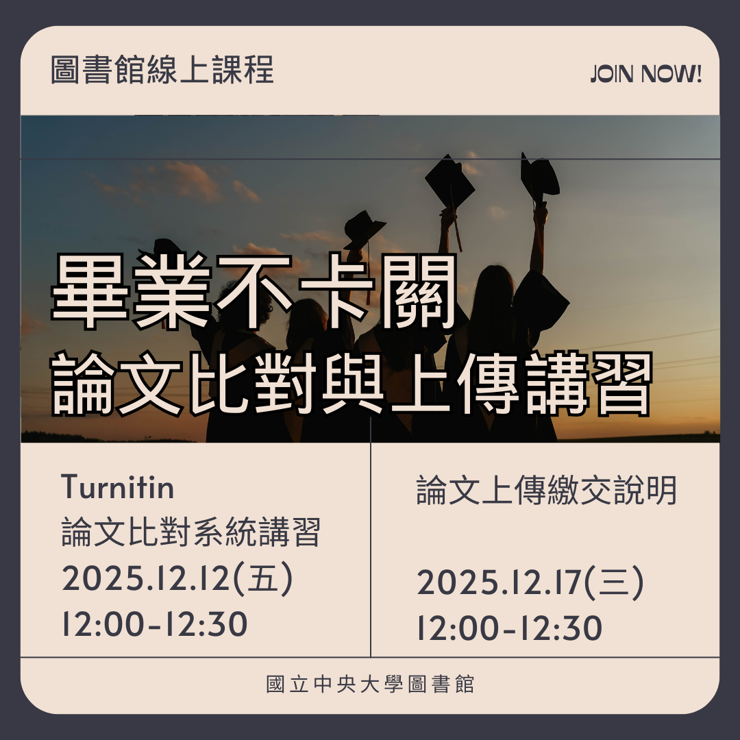 一. 為協助本校畢業生及各系所教職員瞭解Turnitin論文比對系統之操作方式,並熟悉學位論文電子檔上傳流程,圖書館將於114年12月12日(星期五)及12月17日(星期三)中午12:00-12:30辦理兩場線上講習。報名網址如下: